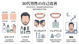 メンズ美容総合 30代の自分磨きは何から始めるべき?見た目・清潔感・老け対策を一気に解説 30代男性の自分磨きを5つのカテゴリ(老け顔・薄毛・口臭・香水・睡眠)に分けて徹底解説。清潔感と若々しさを手に入れるための実践的な方法を網羅的にご紹介します。 2026年03月07日 メンズ美容総合